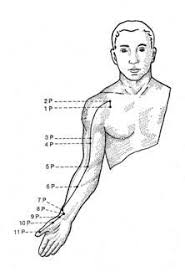 A Librada, de 81 años, le están dejando como una imagen doliente de esas que se ven en las iglesias: Daquian le coloca agujas en la cara interna de las muñecas -"es uno de los puntos esenciales del cuerpo, en la acupuntura"-, en la región externa de la piernas y otra más entre las mamas. Su ayudante, Xu -director de la clínica madrileña que ha invitado al experto- introduce dos varillas más en los empeines.  La anciana, que permanece quietecita, mirando al techo, padece un dolor en el tórax, -"neuralgia costal", dictamina el especialista.